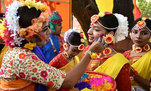 A girl smiles as her fellow applies colored powder on her face during the Pahela Falgun festival in Dhaka, Bangladesh, Feb. 14, 2020. (Str/Xinhua)