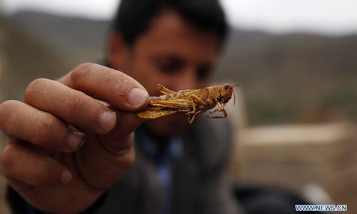 A man displays a locust for food in Sanaa, Yemen, June 24, 2019. A massive outbreak of locusts has posed a serious threat to the agriculture in Yemen. (Photo: Xinhua)