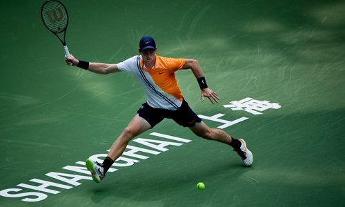 Britain's Kyle Edmund hits a return against Germany's Alexander Zverev during their men's singles quarter-final match at the Shanghai Masters tennis tournament on Friday. Kyle was beaten in the quarter-finals by fourth seed Alexander 6-4 6-4 in one hour 12 minutes. Photo: AFP