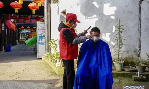 A volunteer barber (L) cuts a man's hair at a community in southwest China's Chongqing Municipality, Feb. 16, 2020. Since the outbreak of the novel coronavirus, most barbershops have been closed. A community in Beibei District of Chongqing organized a team of volunteer barbers to provide free haircuts for its residents. (Xinhua/Liu Chan)