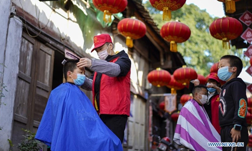 A volunteer barber cuts a boy's hair at a community in southwest China's Chongqing Municipality, Feb. 16, 2020. Since the outbreak of the novel coronavirus, most barbershops have been closed. A community in Beibei District of Chongqing organized a team of volunteer barbers to provide free haircuts for its residents. (Xinhua/Liu Chan)