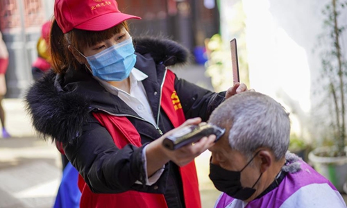A volunteer barber cuts a man's hair at a community in southwest China's Chongqing Municipality, Feb. 16, 2020. Since the outbreak of the novel coronavirus, most barbershops have been closed. A community in Beibei District of Chongqing organized a team of volunteer barbers to provide free haircuts for its residents. (Xinhua/Liu Chan)