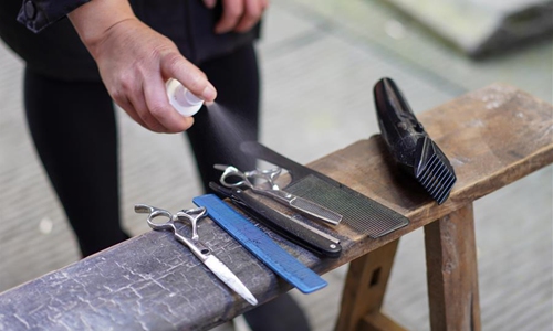 A volunteer barber disinfects tools at a community in southwest China's Chongqing Municipality, Feb. 16, 2020. Since the outbreak of the novel coronavirus, most barbershops have been closed. A community in Beibei District of Chongqing organized a team of volunteer barbers to provide free haircuts for its residents. (Xinhua/Liu Chan)