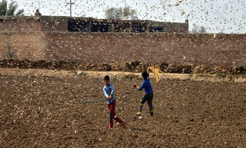 Photo taken with mobile phone on Feb. 15, 2020 shows Pakistani children trying to avoid locusts swarming in Okara district in eastern Pakistan's Punjab province. (Str/Xinhua)