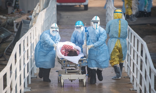 Medical workers help the first batch of patients infected with the novel coronavirus move into their isolation wards at Huoshenshan (Fire God Mountain) Hospital in Wuhan, central China's Hubei Province, Feb. 4, 2020. (Xinhua/Xiao Yijiu)