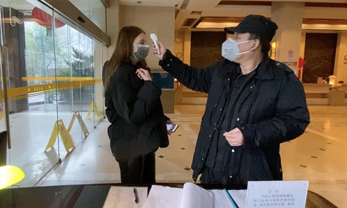 Sofiia Semyholovska has her temperature checked when she returns to the dorm. Photo: Chen Xia/GT