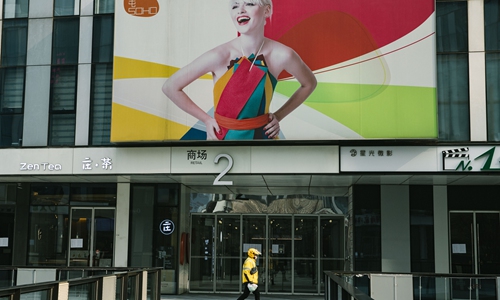 A delivery man walks by a building in the downtown Sanlitun shopping area in Beijing on Wednesday, which is the third day the city officially resume work. As most companies and government institutes decided to let employees work at home during the epidemic, few people can be seen in Sanlitun, which is one of the city's busiest districts. Photo: Li Hao/GT