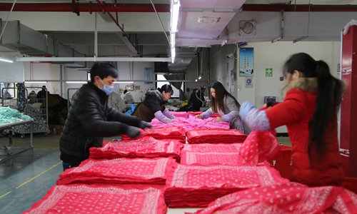 Workers are stacking red kerchiefs at a production line of Yiwu-based Xize Fashion Scarf, which works as original equipment manufacturer for US companies like Gap and Macy's. File Photo: Chen Qingqing/GT