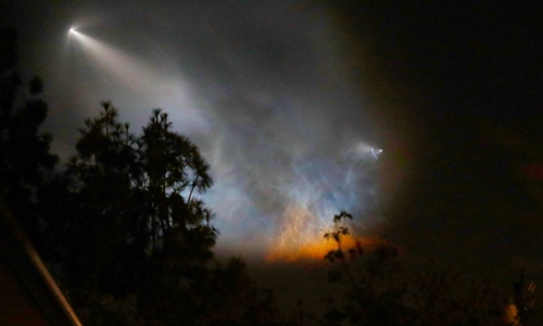 A SpaceX Falcon 9 rocket lights up the sky over Los Angeles, California, the United States, on Oct. 7, 2018. U.S. (Xinhua/Li Ying)