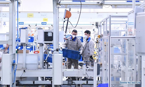 Staff members work at the engine plant of FAW-Volkswagen Automobile Co., Ltd. in Changchun, northeast China's Jilin Province, Feb. 17, 2020. Companies resumed production with epidemic prevention measures during the outbreak of the novel coronavirus. (Photo by Yan Linyun/Xinhua)