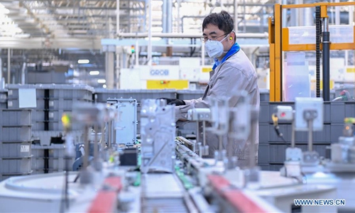 A worker works at the engine plant of FAW-Volkswagen Automobile Co., Ltd. in Changchun, northeast China's Jilin Province, Feb. 17, 2020. Companies resumed production with epidemic prevention measures during the outbreak of the novel coronavirus. (Photo by Yan Linyun/Xinhua)