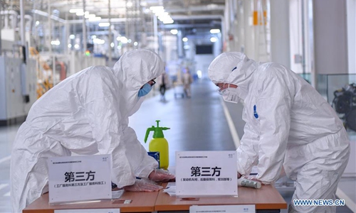 Epidemic control staff are seen at the engine plant of FAW-Volkswagen Automobile Co., Ltd. in Changchun, northeast China's Jilin Province, Feb. 17, 2020. Companies resumed production with epidemic prevention measures during the outbreak of the novel coronavirus. (Photo by Yan Linyun/Xinhua)