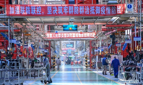 hoto shows the assemble plant of FAW Jiefang truck in Changchun, northeast China's Jilin Province, Feb. 17, 2020. Companies resumed production with epidemic prevention measures during the outbreak of the novel coronavirus. (Photo by Yan Linyun/Xinhua)