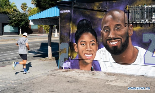 A man runs past a mural honoring NBA star Kobe Bryant and his daughter, who died in a helicopter crash, in Los Angeles, the United States, Feb. 16, 2020. (Photo by Qian Weizhong/Xinhua)