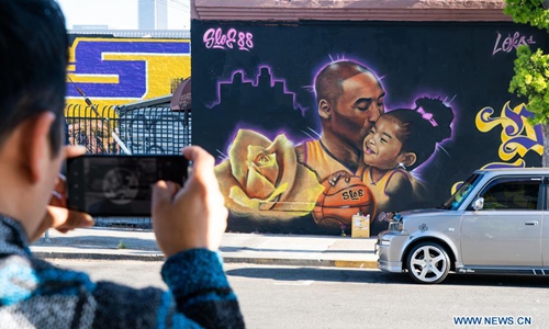A man photographs a mural honoring NBA star Kobe Bryant and his daughter, who died in a helicopter crash, in Los Angeles, the United States, Feb. 16, 2020. (Photo by Qian Weizhong/Xinhua)
