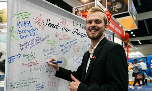 A visitor writes down words in support of China's fight against the novel coronavirus at the annual Los Angeles Travel & Adventure Show in Los Angeles, the United States, on Saturday. Photo: Xinhua