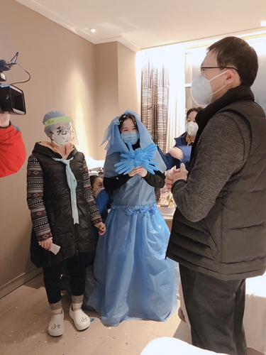 On the evening of February 12, Tang was noticed to attend a meeting at 8 pm. When she stepped into the meeting room, the light was out. After turning on their phone flashlights, everyone shouted "Happy wedding!" She was dressed up by her colleagues with some disposable hospital bedsheets. The groom was also dressed up and watching her from a screen.