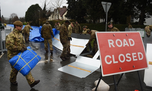 Members of the 4th Battalion Royal Regiment of Scotland erect flood barricades in Ilkley, West Yorkshire on Saturday, as Storm Dennis sweeps in over the UK. Photo: AFP