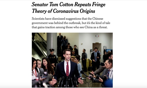 For instance, since the outbreak of this epidemic, US Senator Tom Cotton has constantly claimed that the coronavirus came from a "super laboratory" in Wuhan. Chinese Ambassador to the US Cui Tiankai has refuted this absurd allegation, saying conspiracy theories also exist about the coronavirus originating from the US. But Cotton, and many anti-China people like him, have never ceased their hostility against China.