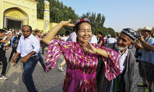 People dance to music during Corban Festival celebrations in Kashgar, northwest China's Xinjiang Uygur Autonomous Region, Aug. 11, 2019. (Xinhua/Wang Fei)