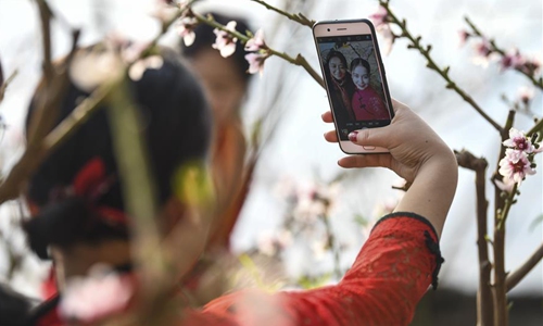 Tourists take selfies with peach blossoms in a greenhouse at Donghu Village of Shanshan County, northwest China's Xinjiang Uygur Autonomous Region, Jan. 11, 2020. Photo: Xinhua