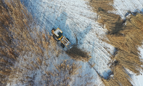 Farmers in the Bayingolin Mongolian Autonomous Prefecture, Northwest China's Xinjiang Uygur Autonomous Region, harvest reeds on Friday.