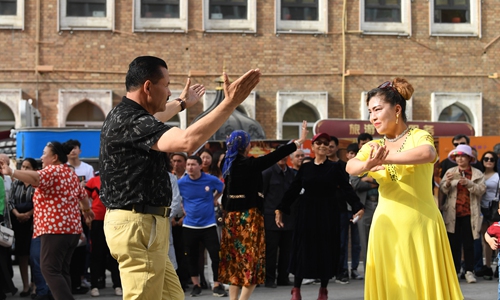 People dance outside the Xinjiang International Grand Bazaar in Urumqi, northwest China's Xinjiang Uygur Autonomous Region, May 22, 2019. Photo: Xinhua