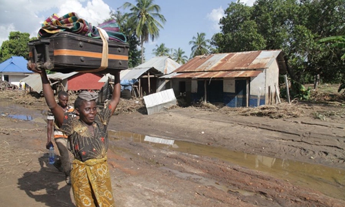 People have been left homeless after their houses were demolished by ongoing torrential rains in Njinjo ward, Kilwa district of Lindi region, in Tanzania, on Jan. 29, 2020. (Xinhua)