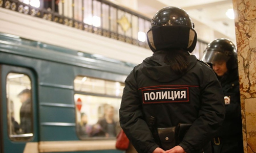 Police officers stand guard on the platform of a metro station in Moscow, capital of Russia, on April 3, 2017. (Xinhua/Oleg Brusnikin)