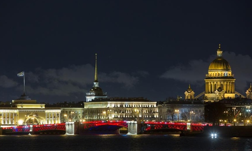 The Palace Bridge is lit in red to mark the Chinese Lunar New Year in St. Petersburg, Russia, Jan. 24, 2020. Photo:Xinhua
