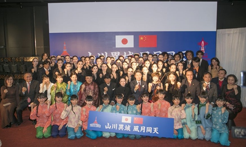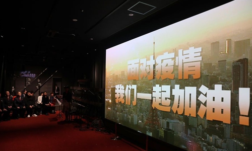 Actors and guests pose for photos to support China in fighting against novel coronavirus inside the Tokyo Tower in Tokyo, Japan, Feb. 18, 2020. (Xinhua/Du Xiaoyi)
