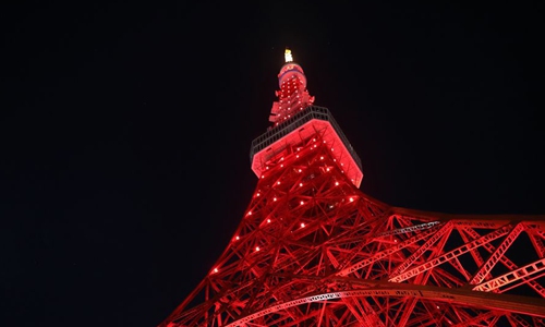The Tokyo Tower is lit in red to support China's battle against the novel coronavirus in Tokyo, Japan, Feb. 18, 2020. (Xinhua/Du Xiaoyi)