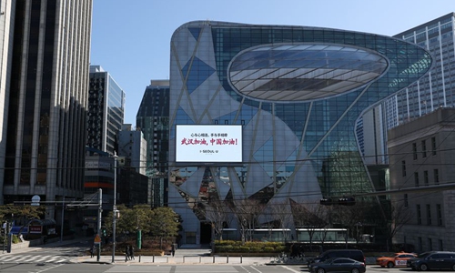 A video cheering for China in fighting against novel coronavirus pneumonia (NCP) is played outside the building of the Seoul Metropolitan Government in Seoul, South Korea, Feb. 18, 2020. (Xinhua/Wang Jingqiang)