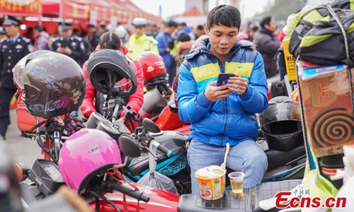 People prepare to ride motorbikes for home at a service station in Wuzhou, South China's Guangxi Zhuang autonomous region Jan. 18, 2020. Many migrant workers in Guangxi chose to go home by motorbike for a family reunion in the Spring Festival, or Chinese traditional lunar New Year, which starts from Jan. 25 this year. Photo:Xinhua