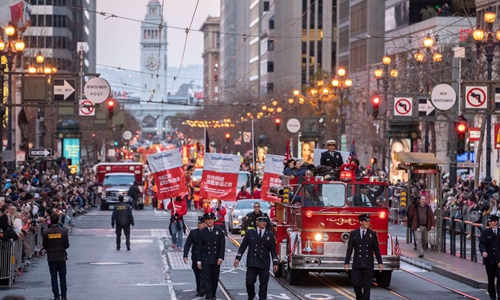 Photo taken on Feb. 8, 2020 shows a parade celebrating the Chinese New Year in San Francisco, the United States.(Photo by Li Jianguo/Xinhua)