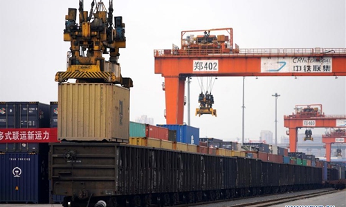 A gantry crane conducts loading operation at the Zhengzhou terminal of China Railway Intermodal in Zhengzhou, central China's Henan Province, Feb. 19, 2020. The sea-rail intermodal freight train, loaded with 35 sets of containers, left from Zhengzhou terminal of China Railway Intermodal in Henan to Qingdao port of east China's Shandong Province on Wednesday, making the restoration of its regular operation after the Chinese Spring Festival of 2020. (Xinhua/Li An)