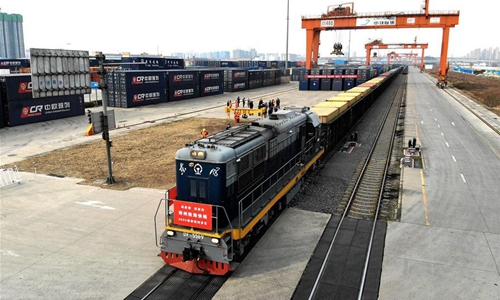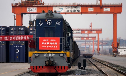 A sea-rail intermodal freight train waits for departure at the Zhengzhou terminal of China Railway Intermodal in Zhengzhou, central China's Henan Province, Feb. 19, 2020. The sea-rail intermodal freight train, loaded with 35 sets of containers, left from Zhengzhou terminal of China Railway Intermodal in Henan to Qingdao port of Shandong on Wednesday, making the restoration of its regular operation after the Chinese Spring Festival of 2020. (Xinhua/Li An)