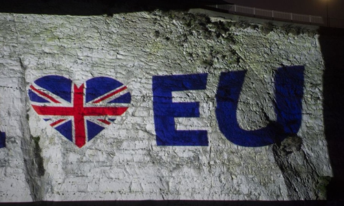 The message "We still love EU" is projected on the cliffs of Ramsgate in Ramsgate, Britain, on Jan. 31, 2020. (Photo by Ray Tang/Xinhua)