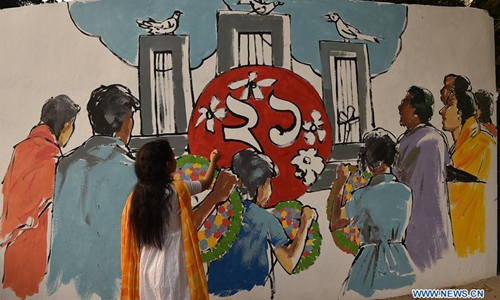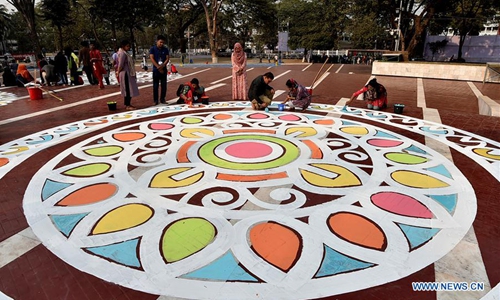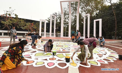 Artists paint in front of the language martyrs' memorial monument in Dhaka, Bangladesh, on Feb. 19, 2020. Bangladesh is preparing to celebrate the International Mother Language Day which falls on Feb. 21. The United Nations Educational, Scientific and Cultural Organization (UNESCO) declared Feb. 21 as the International Mother Language Day. (Str/Xinhua)