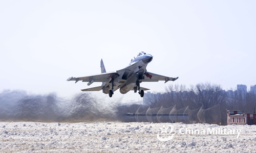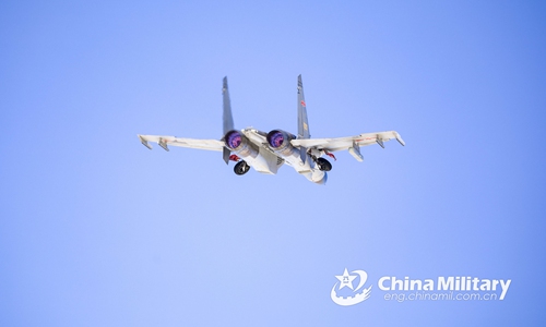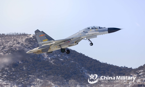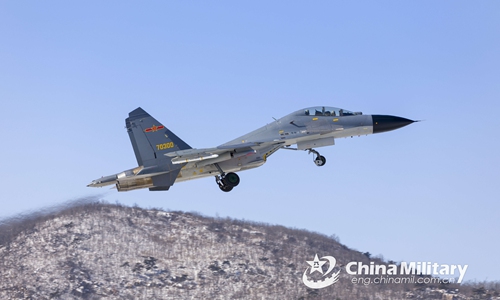 A J-11 fighter jet attached to an aviation brigade of the air force under the PLA Northern Theater Command flies through a mountainous region during a flight training exercise on February 17, 2020. (eng.chinamil.com.cn/Photo by Wang Jingwen)