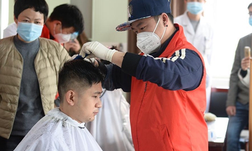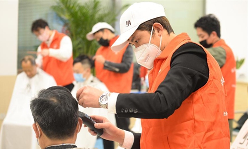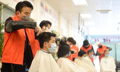 Volunteer barbers provide haircut service for medical workers at Chengdu First People's Hospital in Chengdu, capital of southwest China's Sichuan Province, Feb. 19, 2020. Chengdu Municipal Health Commission and Chengdu Cloud for Public Good Development Association organized nearly 100 volunteer barbers to provide free haircuts for medical workers working in hospitals and medical institutions in the city on Wednesday. (Photo by Xu Bingjie/Xinhua)