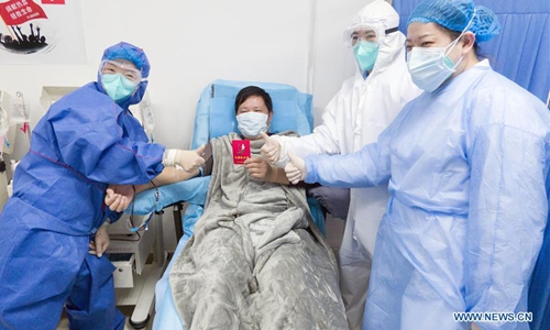 A recovered coronavirus patient from Huanan seafood market donates plasma at Wuhan Blood Center in Wuhan, capital of central China's Hubei Province, Feb. 17, 2020. (Xinhua/Cai Yang)