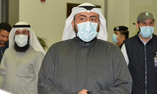 Kuwaiti Minister of Health Bassel Al-Sabah (C) waits for the arrival of the first flight from Iran with Kuwaiti nationals at Kuwait International Airport in Farwaniya Governorate, Kuwait, Feb. 22, 2020. Kuwait received the arrival of the first flight from Iran with Kuwaiti nationals on Saturday, as part of the country's evacuation plan after the COVID-19 outbreak in Iran. (Photo by Asad/Xinhua)