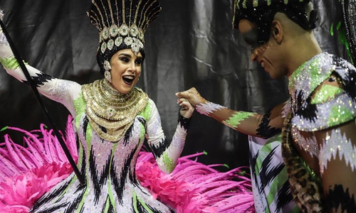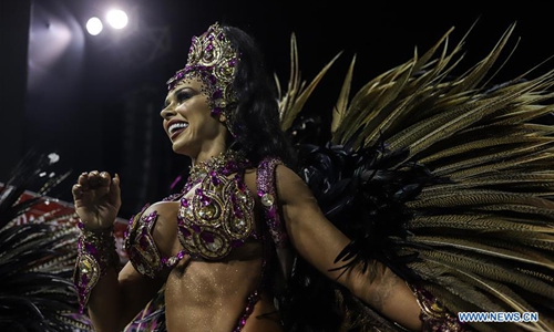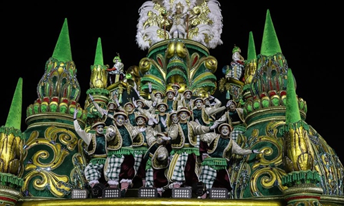 Members of the samba school "Mancha Verde" take part in the carnival parade in Sao Paulo, Brazil, Feb. 22, 2020. (Photo by Rahel Patrasso/Xinhua)