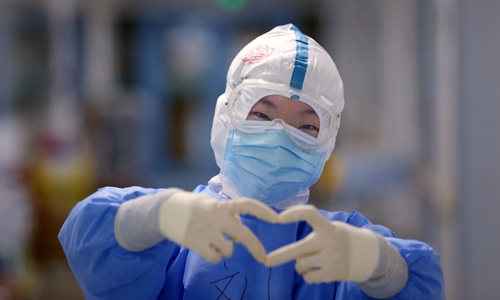 Medical personnel from Peking Union Medical College Hospital at the ICU of Wuhan Tongji Hospital express their longings, by drawing hearts and flowers on protective suits and making finger hearts on Feb 14 amid the COVID-19 outbreak. Photo: Cui Meng/GT