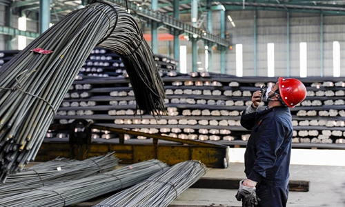 A worker at Tonglin Fuxin Iron and Steel Co controls a machine to hoist hot-rolled ribbed steel bars in Tonglin, East China's Anhui Province on Monday. The company has strengthened production amid the novel coronavirus fight to guarantee sufficient supply for key national projects. Its daily output can now reach 5,000 tons, recovering to its normal level of 2019. Photo: cnsphotos