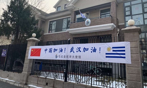 A slogan reading "China, stay strong! Wuhan, stay strong!" is hung at the fence of the Uruguayan Embassy in Beijing to express solidarity. Photo: Courtesy of Uruguayan Embassy in China