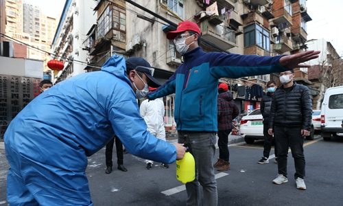 A community service employee sprays disinfectant on a local resident on Feb 19 in Wuhan, Central China’s Hubei Province, which is also the epicenter of the COVID-19 outbreak. The city government has launched door-to-door visits of every household and imposed strict quarantine measures in residential communities. Photo: Cui Meng/GT