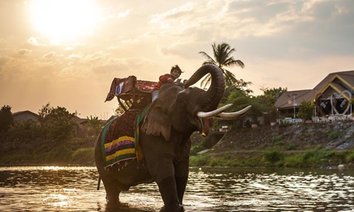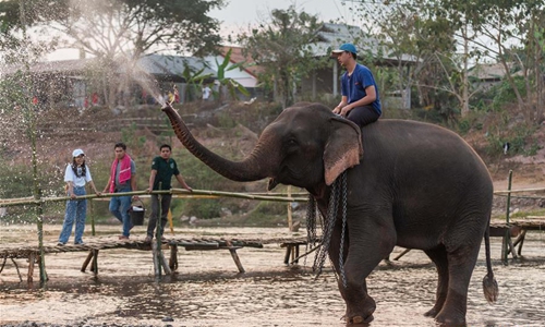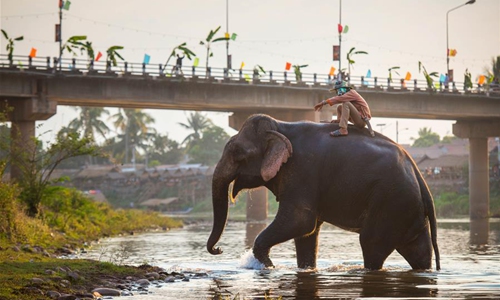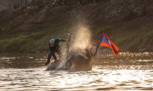 A man rides on an elephant during the Elephant Festival in a tributary of Mekong River in northern Lao province of Xayaboury, on Feb. 22, 2020. The annual Elephant Festival lasts from Feb. 22 to Feb. 28 this year. (Photo by Kaikeo Saiyasane/Xinhua)