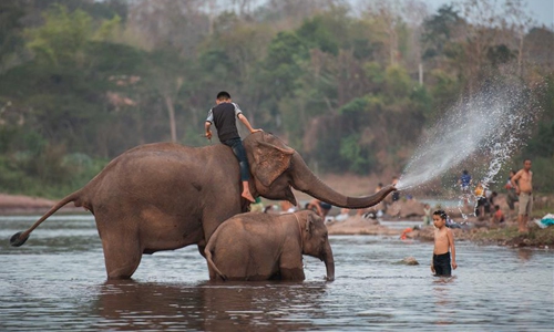 Kids play with elephants during the Elephant Festival in a tributary of Mekong River in northern Lao province of Xayaboury, on Feb. 22, 2020. The annual Elephant Festival lasts from Feb. 22 to Feb. 28 this year. (Photo by Kaikeo Saiyasane/Xinhua)